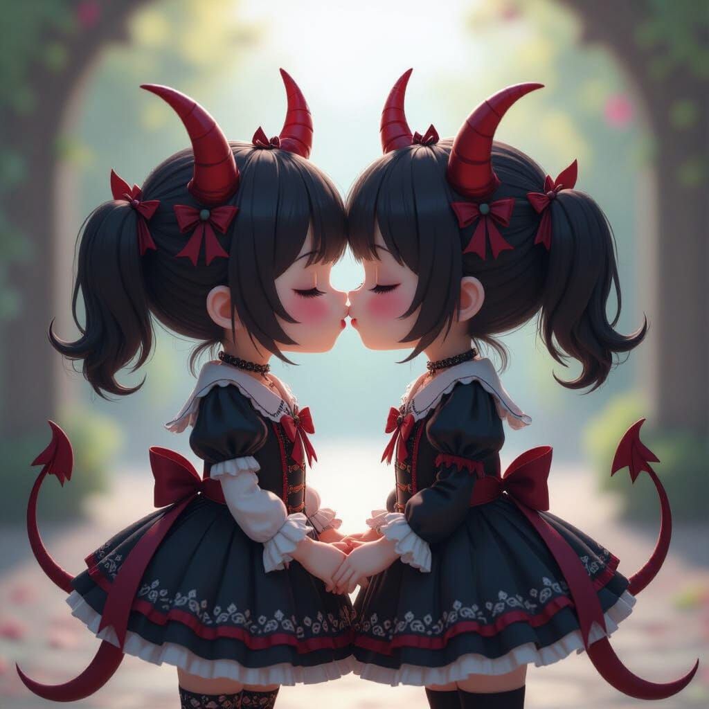 This image shows two cute demon girls in gothic Lolita attire sharing a tender kiss. Rendered in a vibrant 3D anime art style with dynamic lighting and vivid colors.