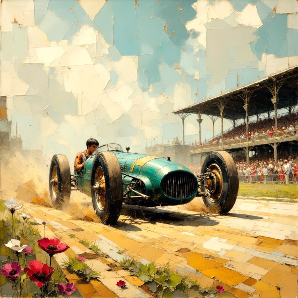 A vibrant oil painting of a vintage race car speeding down a track, kicking up dust. The textured painting uses an impasto technique and a rich color palette.