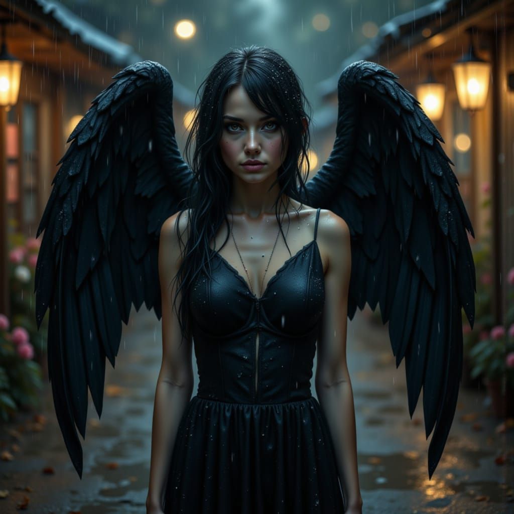 A hyperrealistic photo of a woman with black wings in a rainy, snowy old market at night. Cinematic scene with detailed skin and soft shadows, creating a horror atmosphere.