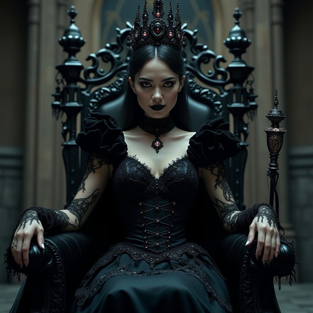 A portrait of an evil emperor girl in dark gothic attire, sitting on a grand throne within a foreboding castle, grasping a scepter with malevolent intent
