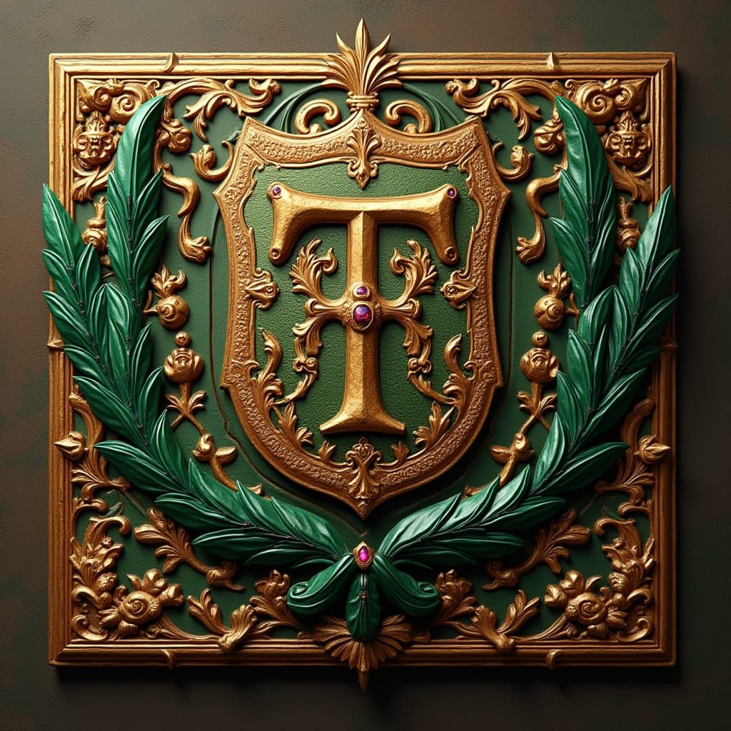 A gleaming silver emblem featuring golden letters, encircled by ruby lozenges representing the twelve tribes of Israel. Emerald flourishes accent this digital artwork rendered with Unreal Engine 5.