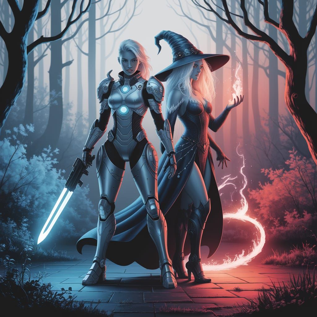 A stunning portrait in a solarpunk-biopunk style, capturing a fierce female warrior clad in metallic armor with glowing cybernetic enhancements standing alongside a mystical frost-fire witch with icy tendrils and ethereal flames dancing around her. The chiaroscuro effect creates a breathtaking contrast between cold blues and whites gradually transitioning to warm oranges and reds, highlighting their intricate textures and rich hues. The background is a misty, enchanted forest with bioluminescent flora casting an otherworldly glow, blending seamlessly with the figures' supernatural auras.