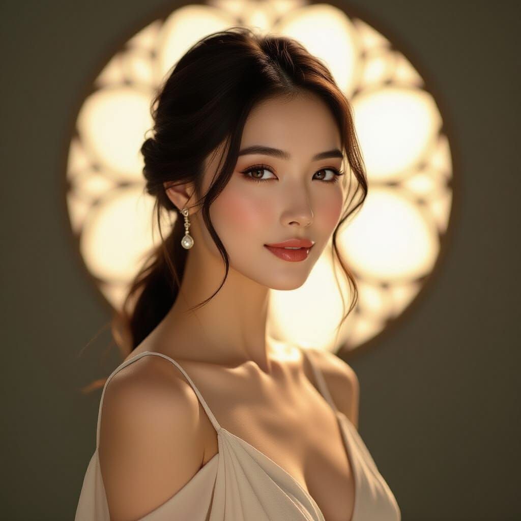 This image shows a beautiful French-Japanese woman with a gentle smile, wearing a flowing dress. The ambient lighting and soft focus evoke sensuality and innocence in an art nouveau style.