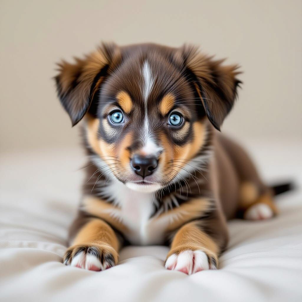 This hyperrealistic image shows a cute brown puppy with heterochromia, one blue eye and one brown. Studio lighting and fine fur details create a striking portrait.