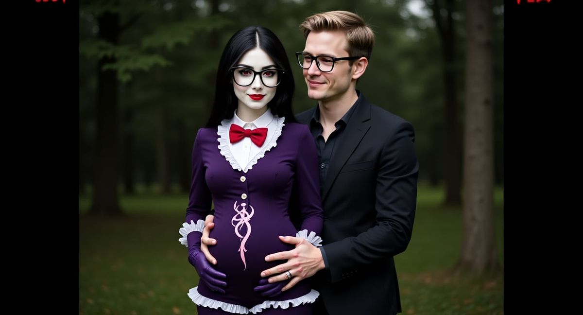 A striking image of Nyarlathotep as a beautiful pale woman in modern attire. She has red eyes and black hair, wearing a purple dress suit with serpentine design, captured in a photorealistic style.