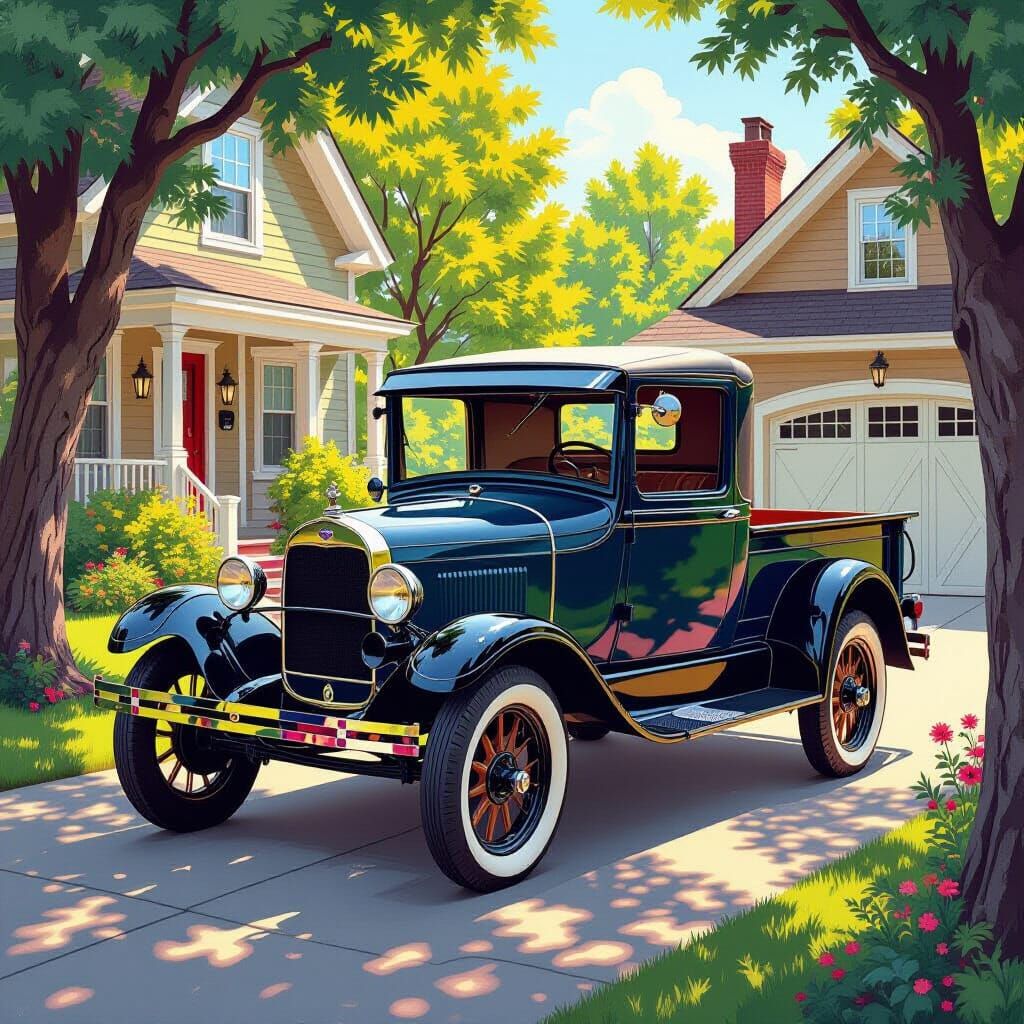 A vintage Ford Model T pickup truck arrives at a suburban home. The image features vivid colors, fine details and an asymmetrical composition in a surreal and magical aesthetic.