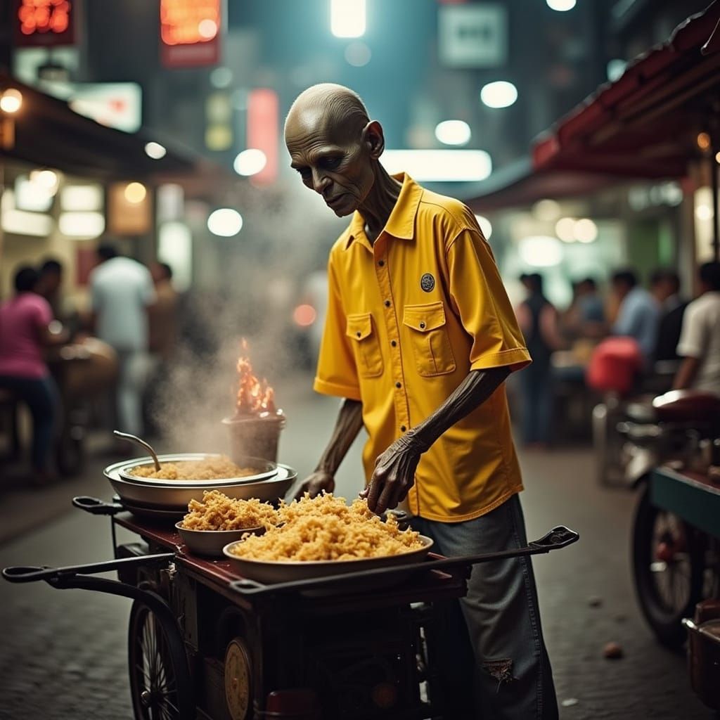 This image shows Frankenstein in a vendor shirt selling balut from a street cart on a busy Manila street. The scene is rendered with neon cityscapes and vibrant character designs.