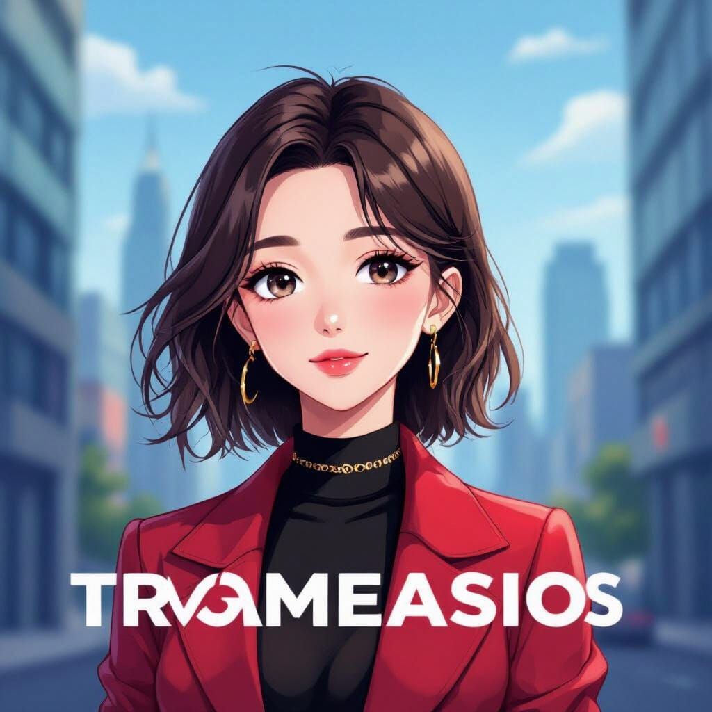 This AI-generated image features a cartoon-style portrait with clear facial features, set against a backdrop of modern architecture and contemporary clothing. The artwork has a distinct anime aesthetic.