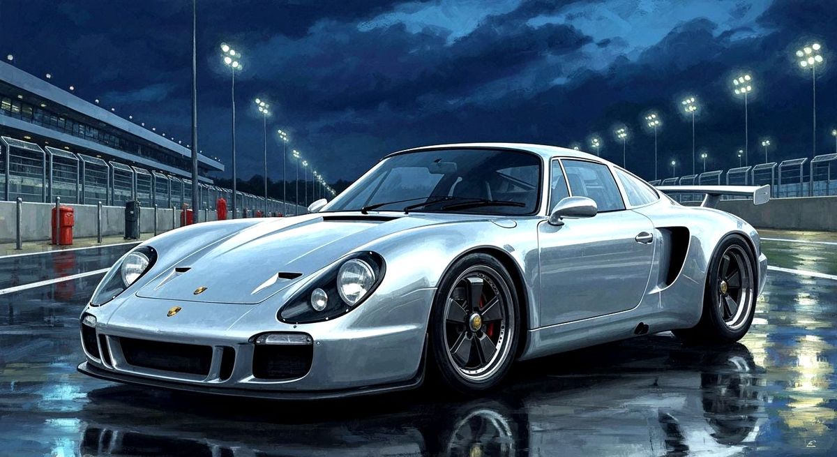 This image showcases a cutting-edge retromodern sports car, inspired by 1960s Porsche designs, parked in a rainy pit lane at Nürburgring. Rendered in an impasto acrylic style.