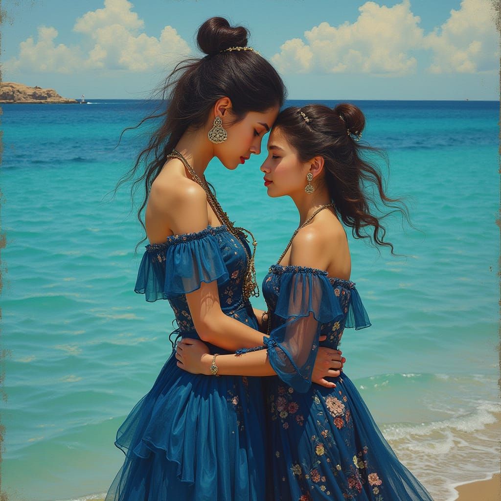 MΓ£e e filha grΓ‘vida, entrelaΓ§adas sobre Γ‘guas serenas, com rostos tocando-se ternamente, envoltas em tecido vitral lΓquido de azul, Γ’mbar e pΓΊrpura, com medalhΓ£o antigo "BG" sobre o ombro materno, sob a lua crescente prateada, em estilo romΓ’ntico e orientalista, inspirado por Picasso, com pinceladas ...