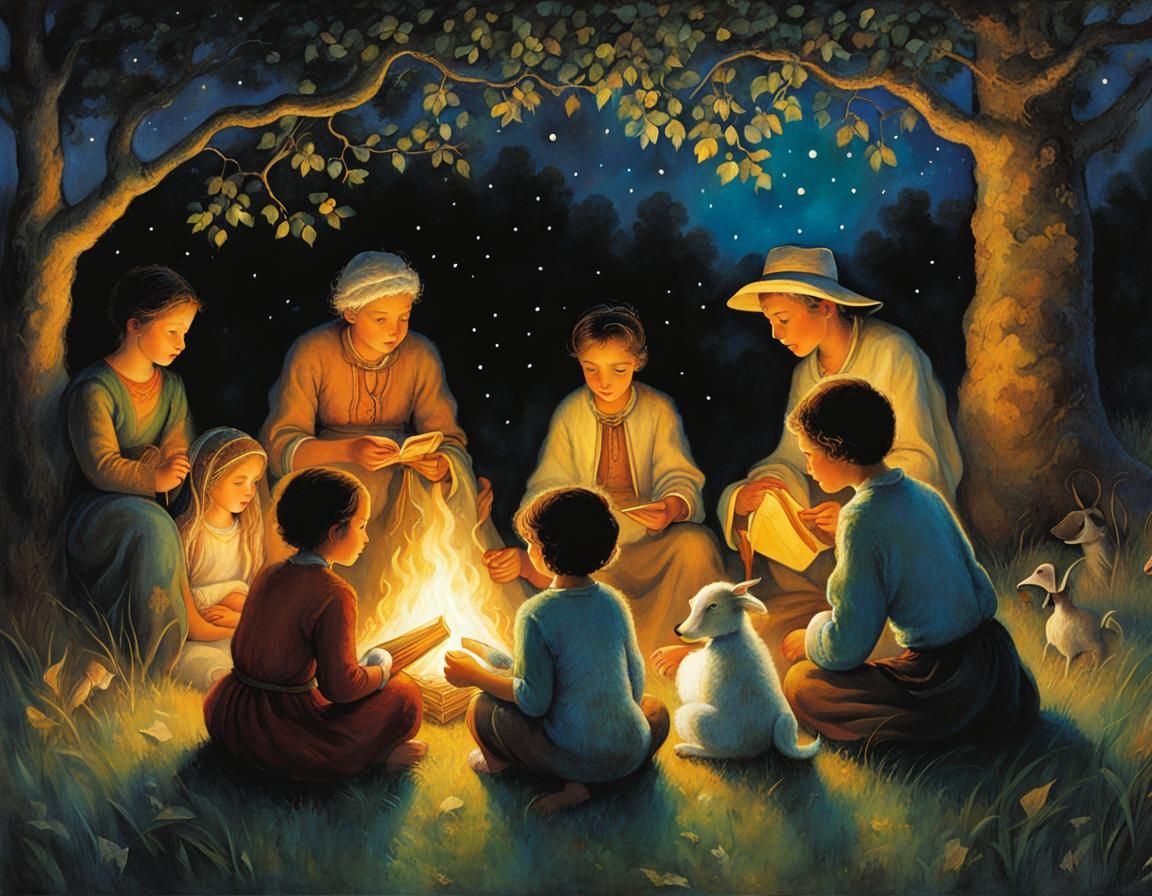 A heartwarming scene of an old shepherd narrating tales to his grandchildren by a campfire on a summer night. This image evokes a style reminiscent of early 20th-century expressionist painting.