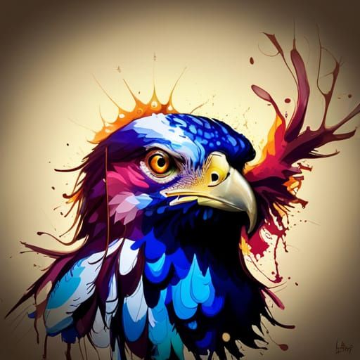 This image shows a beautiful and adorable buzzard with round, reflective eyes. It's rendered as a hyper-realistic cartoonish inkblot drawing with detailed brush strokes and high saturation.