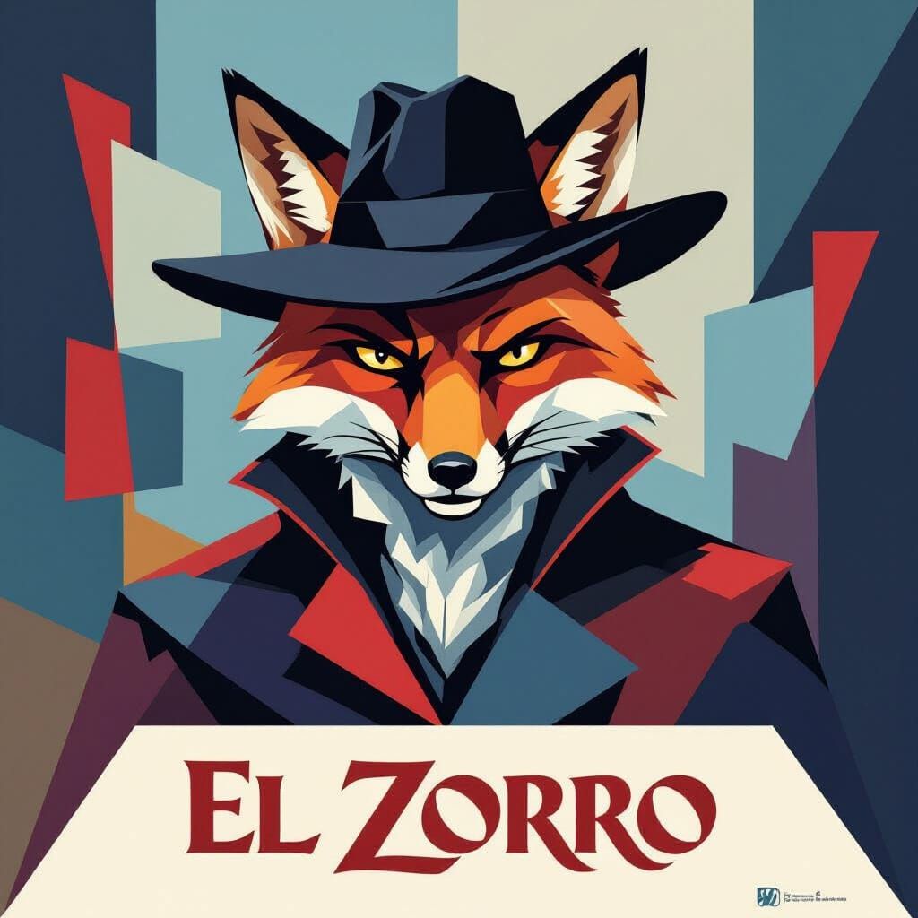A striking movie poster for "El Zorro" rendered in a cubist style. It features geometric shapes, fractured perspectives, and bold lines in blues, reds, and blacks.