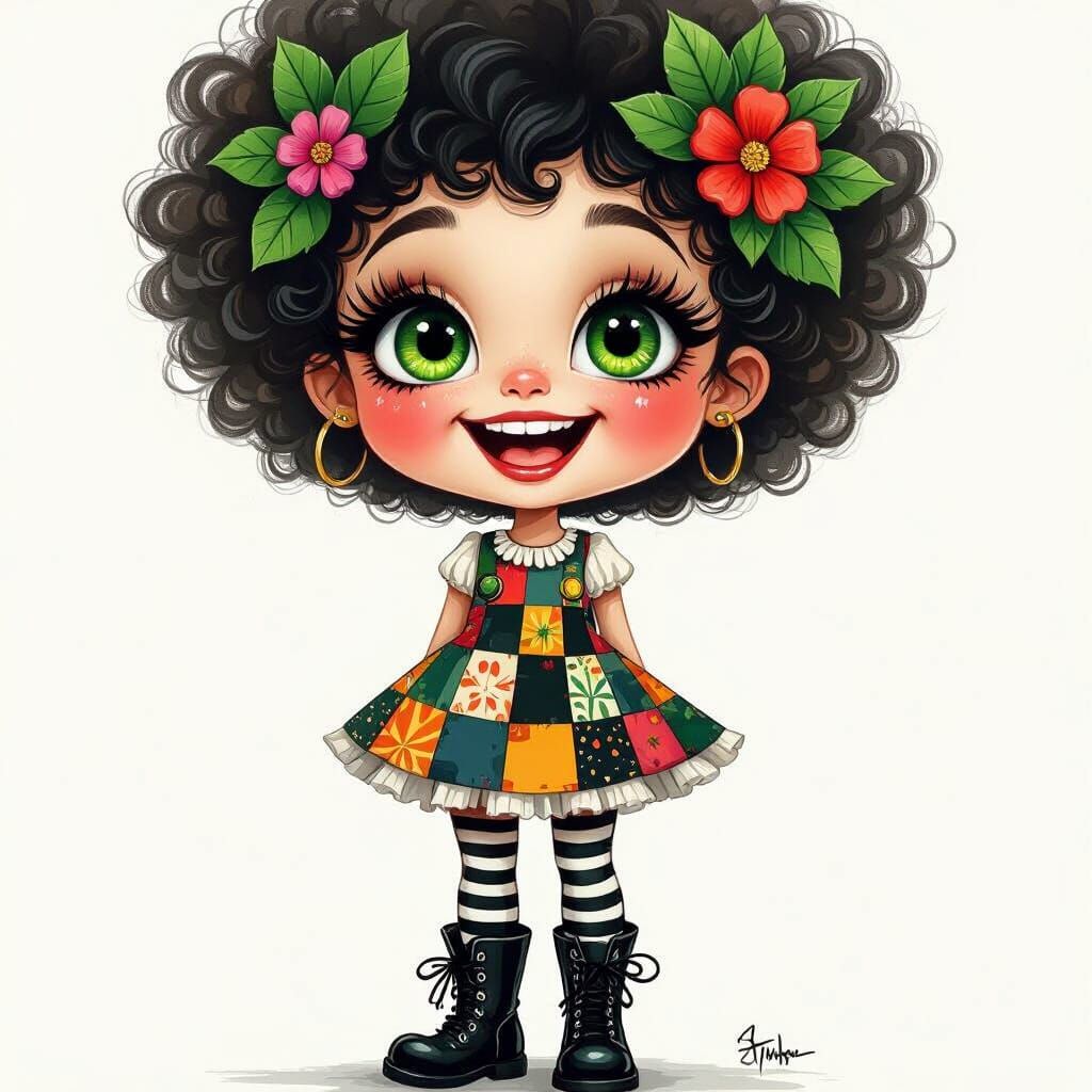 An acrylic ink airbrushed illustration of a sassy young girl with big green eyes and leafy hair ornaments. She is depicted laughing, wearing a patchwork dress, in a vibrant, detailed rendering.