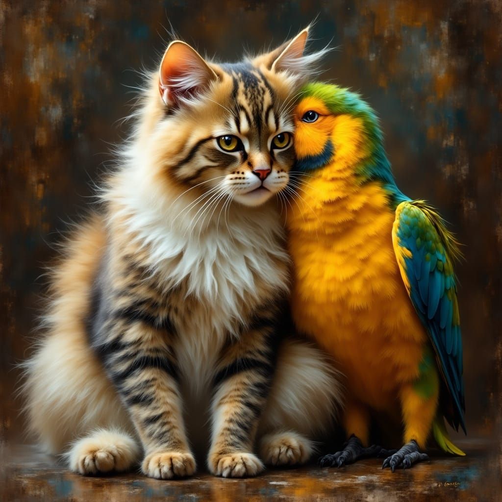 Unlikely friends of a longhaired fluffy cat and a Parrot, hugging each other in love