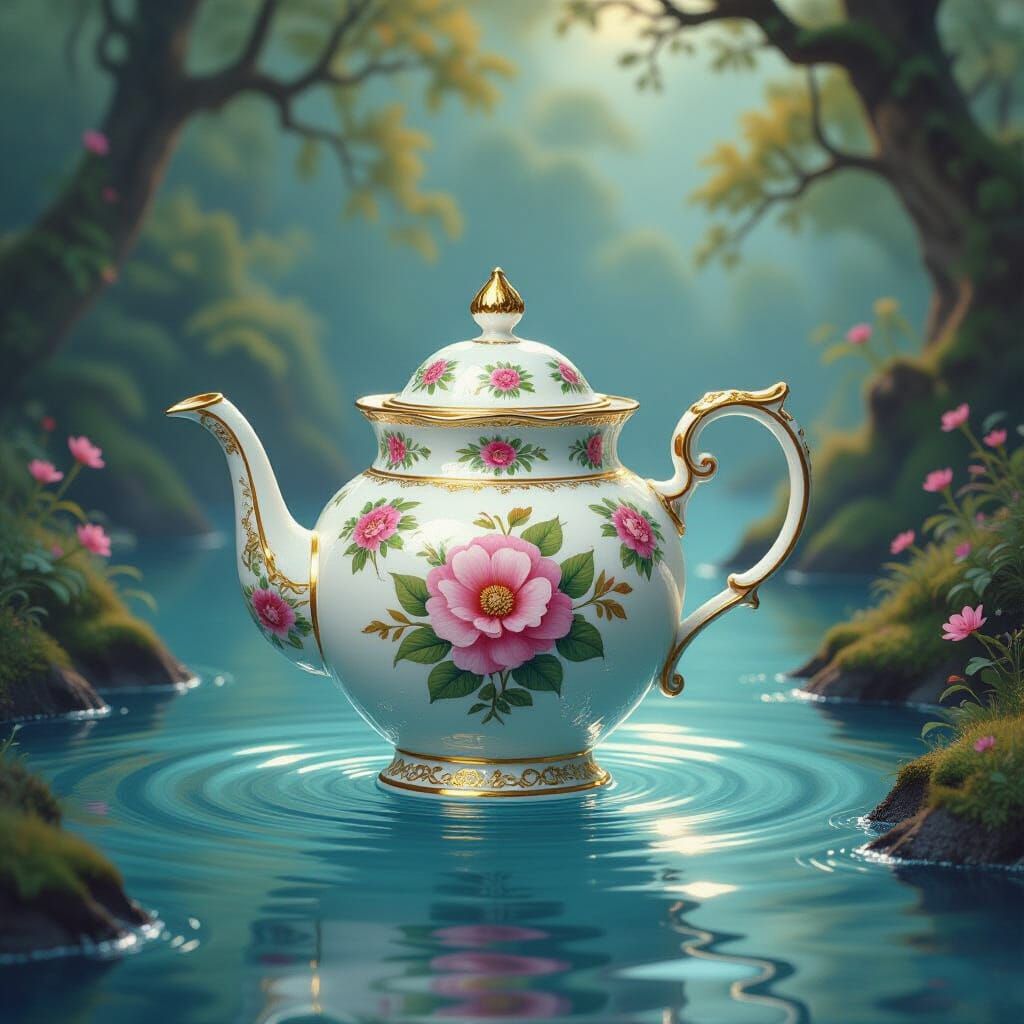 This image shows a detailed antique teapot with floral patterns and a golden lid, balanced on a shimmering portal. It's rendered in a whimsical, matte painting style inspired by classic illustrators.