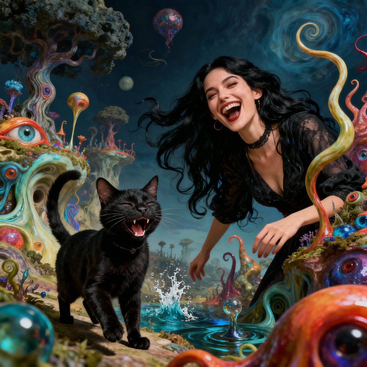 This image shows a woman with long black hair and a laughing black cat exploring a surreal world. The art style is reminiscent of Salvador Dali, featuring intricate details and deep, fantastical colors.