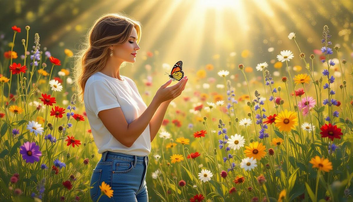 This image shows a middle-aged woman in casual attire, standing in a sunlit wildflower garden and holding a butterfly. The art nouveau style incorporates rich greens, blues, and golds.