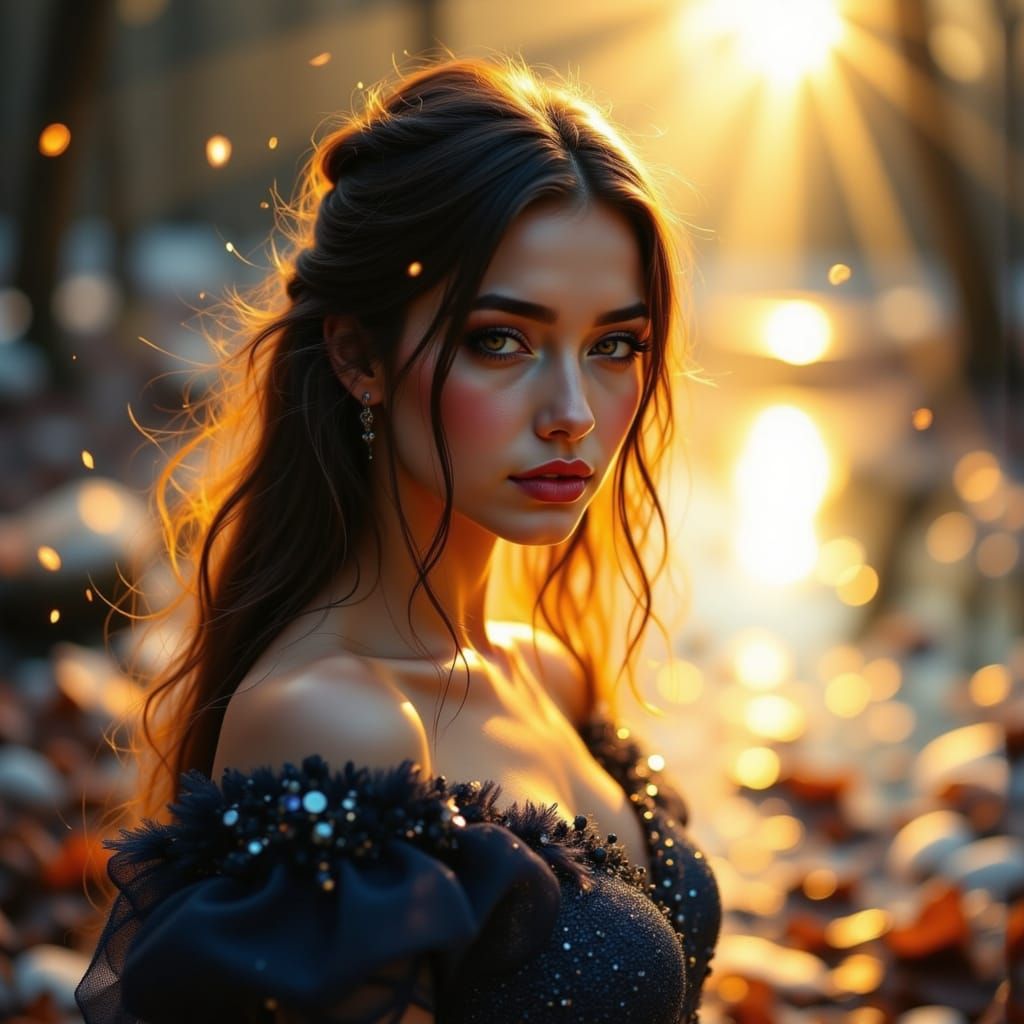 This hyperdetailed image showcases a Siberian princess with long black braids, adorned in glitter and beads in Slavic pagan attire. She stands before an icy stream at dawn, bathed in volumetric, luminous light.