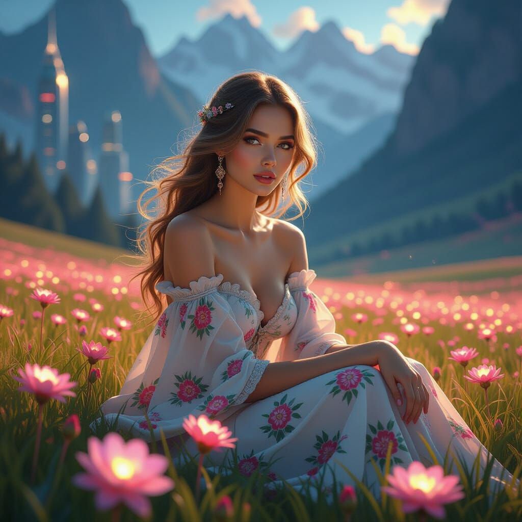 This image shows a beautiful woman with golden hair in a field of glowing flowers. A futuristic city is in the background, all rendered with dramatic lighting and vivid colors as digital art.