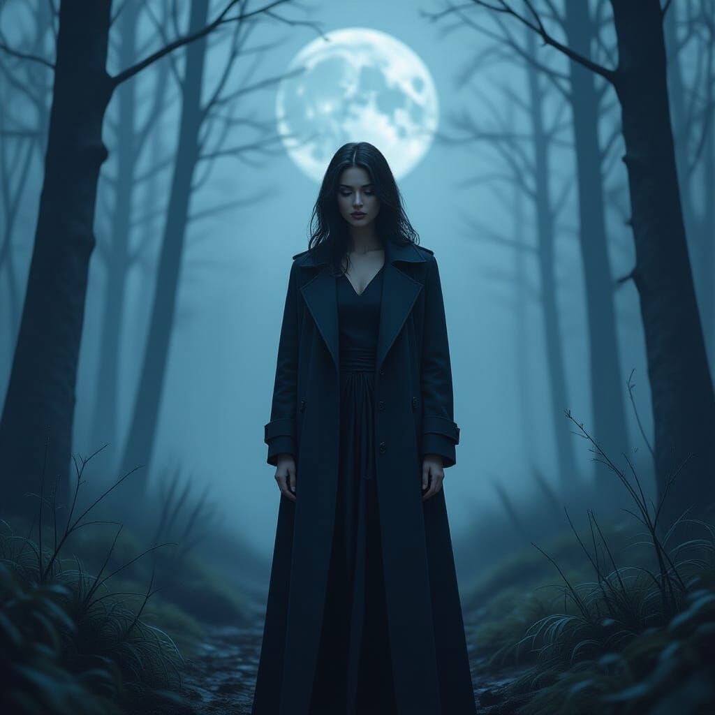 This image shows a solitary woman in a misty forest under moonlight, lost in thought. The artwork evokes a mystical atmosphere with deep emotional resonance, reminiscent of digital painting.