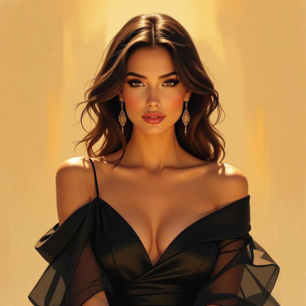 A portrait of an elegant woman in a refined setting, bathed in golden light. The image features intensive brushstrokes and flowing, layered textures in a painterly style.