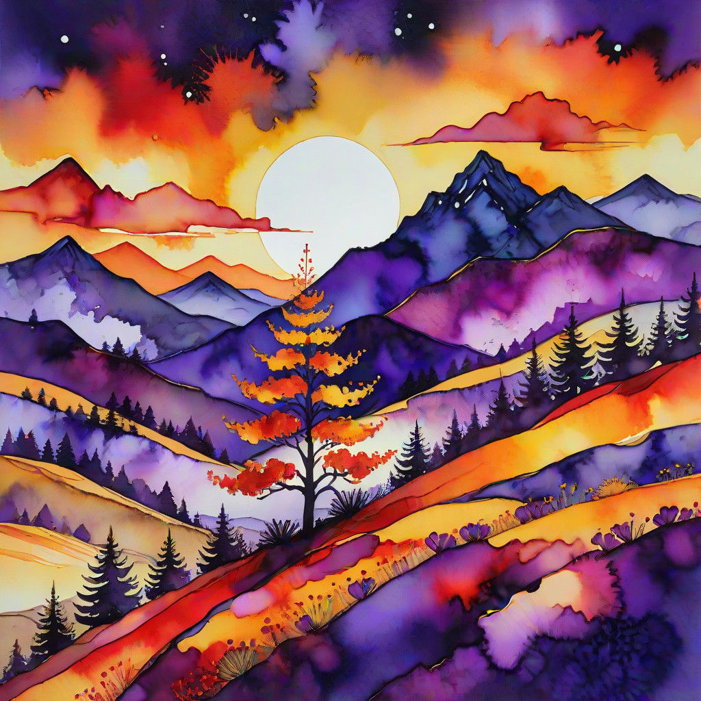 This image shows a breathtaking sunset hillside landscape painted in a unique blend of watercolor and alcohol ink techniques, featuring a solitary Christmas tree flower amidst a golden-hued backdrop, with vibrant colors and a vintage aesthetic.