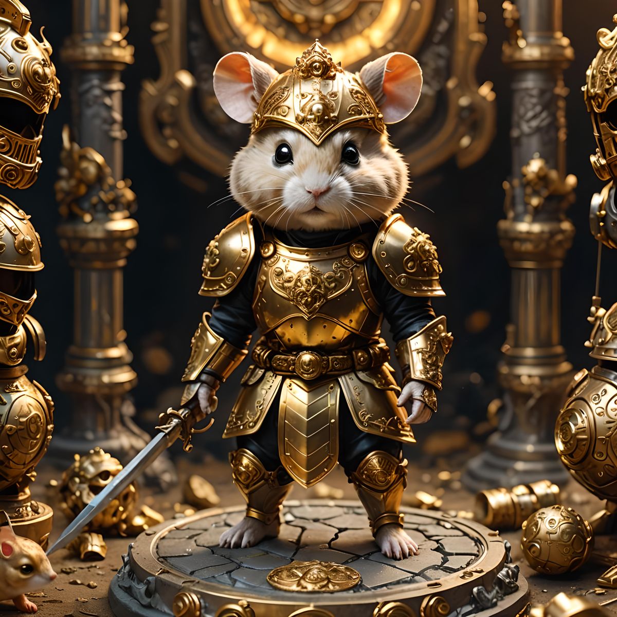 This image shows a hamster fight with combatants wearing golden armor and divine masks. The image depicts a fantastical scene of small creatures in elaborate battle attire.