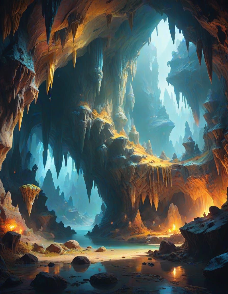 A striking picture of a fantasy cave system filled with glowing crystals. The vibrant oil painting aesthetic shows stalactites, stalagmites, and a misty atmosphere with warm, golden lighting.
