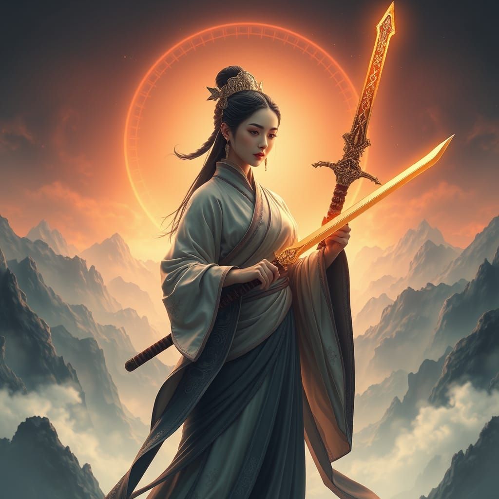 A fantastic, surreal painting capturing the essence of spiritual martial arts and conceptual art. Set within the stunning grand, mystical mountains, a stunning delicate, beautiful, et Chinese woman holds a stunning, amazing, legendary sword, emanating a divine aura. Surrounding the figure are stunning ...