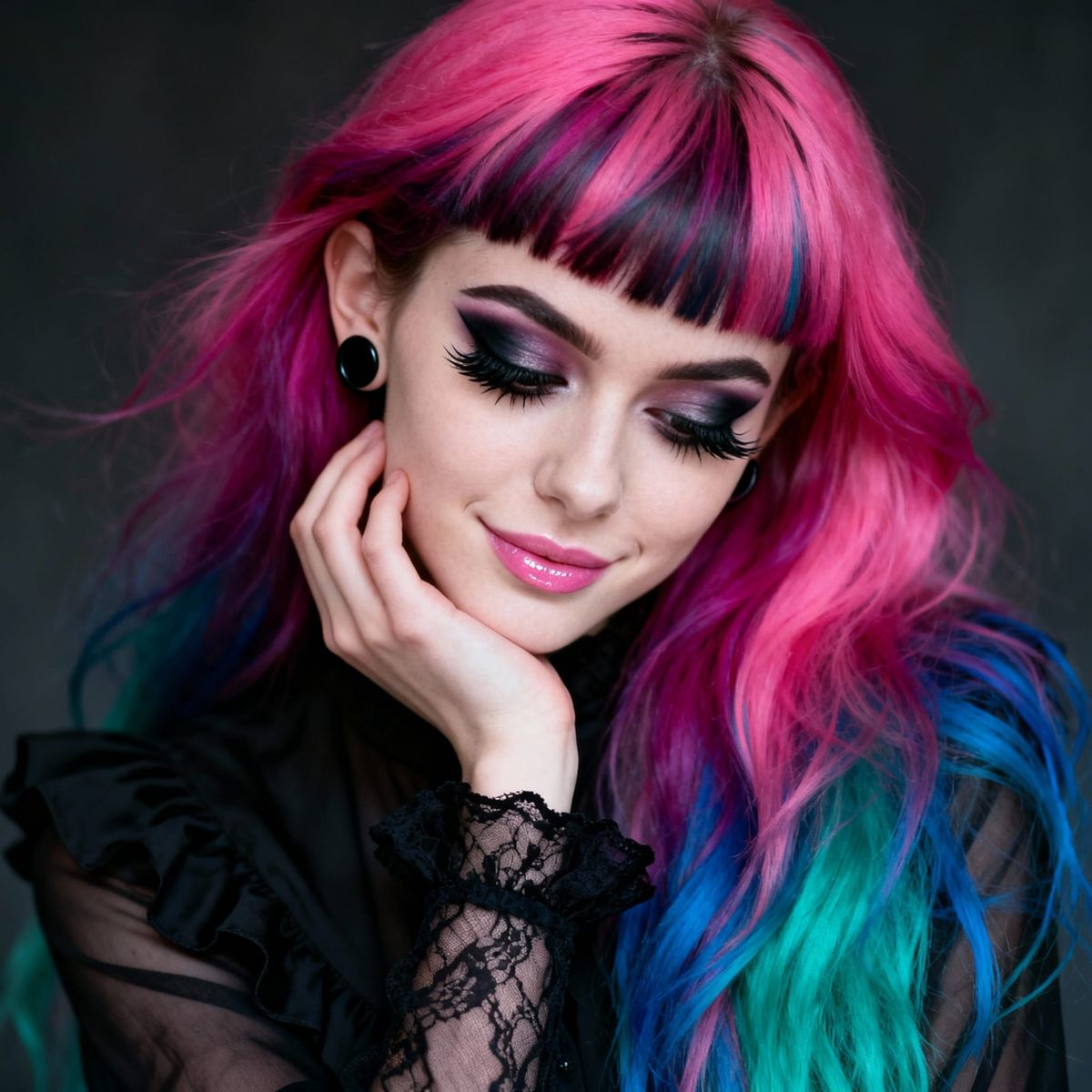 A young woman, appearing to be in her late teens or early twenties with pale skin, is centered in a portrait. She has long, voluminous hair dyed in streaks of bright pink, magenta, teal, and blue, with a sweeping fringe. Her expression is serene, with a subtle, closed-mouth smile and eyes looking downward. ...