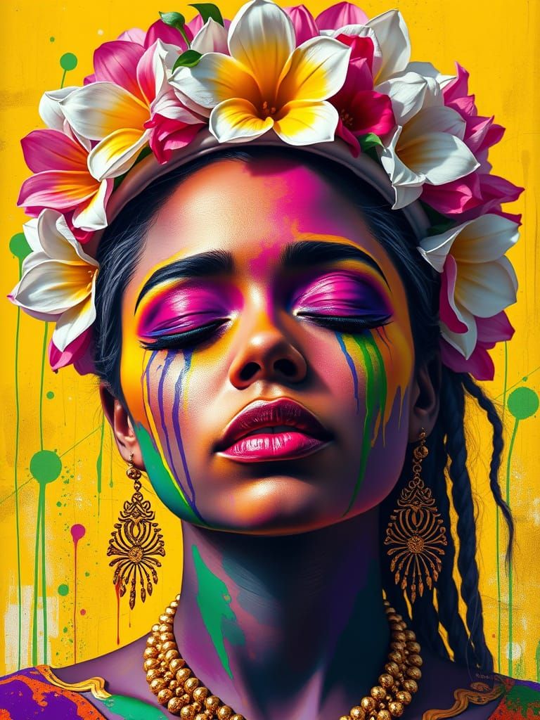 This digital painting features a serene woman of color with eyes closed, her face adorned in bold purple, yellow, and green paint. Colorful drips and abstract splatters create an emotional street art aesthetic.