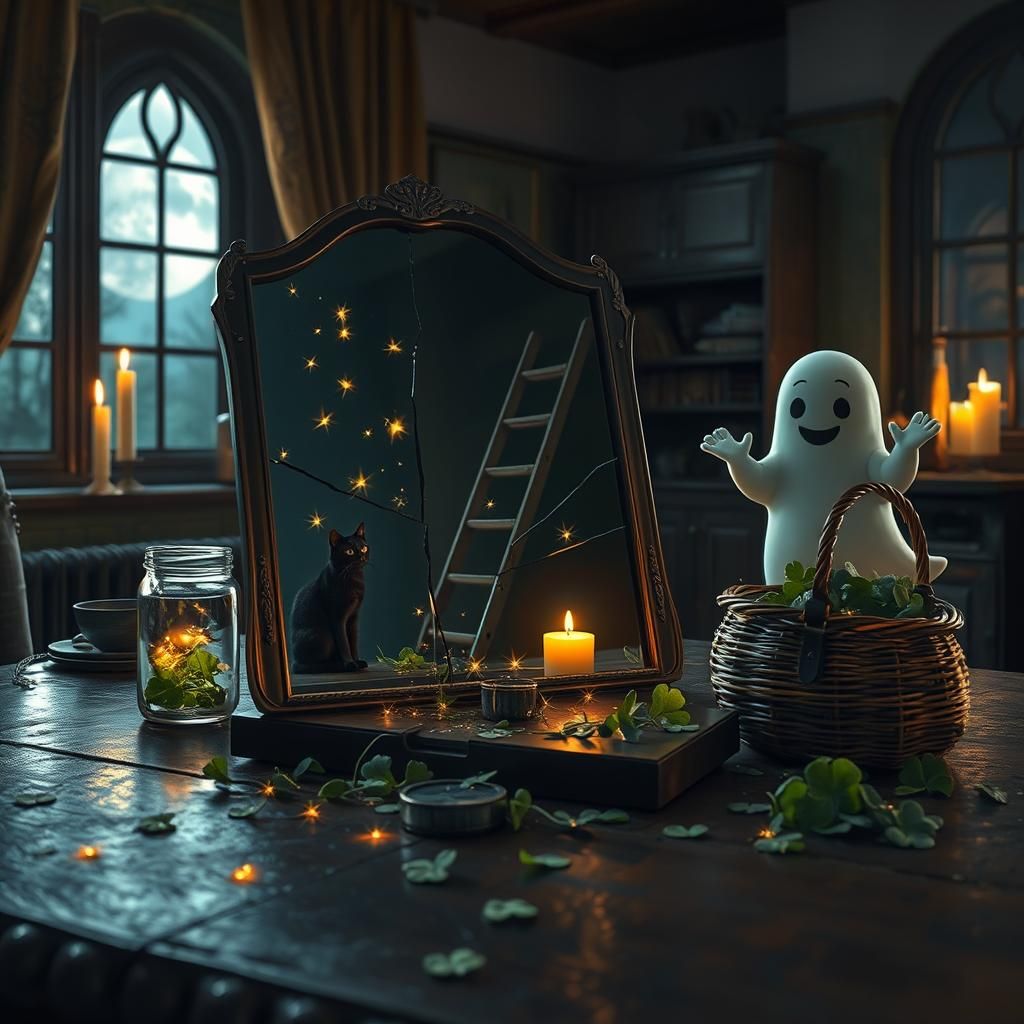 This image shows a broken mirror reflecting surreal scenes in a candle-lit room. A friendly ghost hovers near the mirror, which sits beside fireflies and four-leaf clovers. The scene is a digital matte painting.