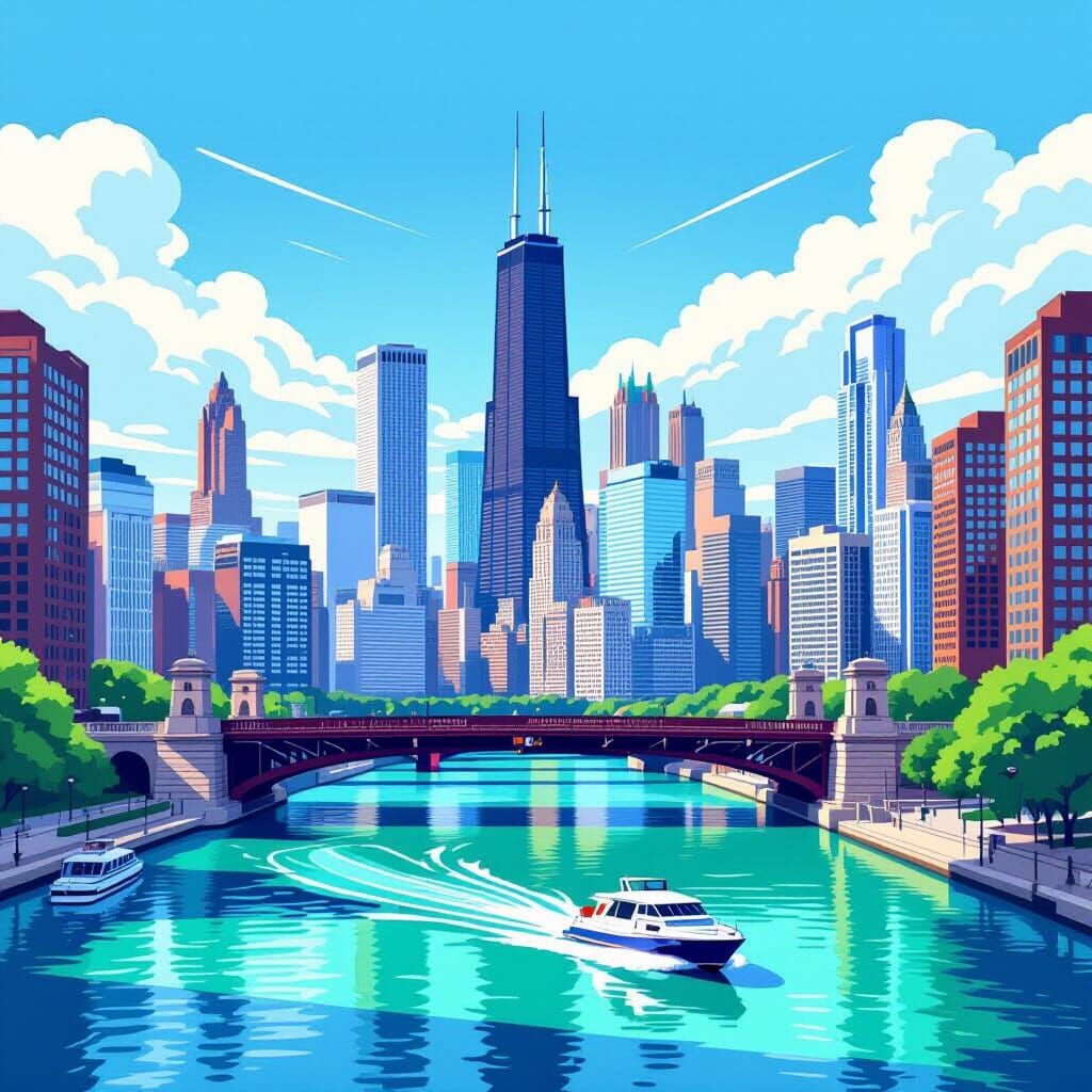 This image shows a stylized graphic art of the Chicago skyline, featuring modern skyscrapers and the Chicago River. A historic bridge and classical building add contrast to the vibrant scene.