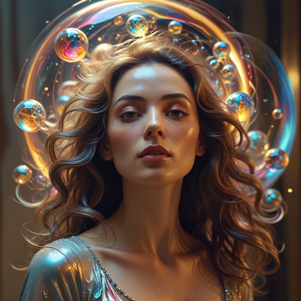 A striking picture of a beautiful woman with flowing hair. The hyperrealistic digital art depicts her surrounded by colorful, glowing orbs in soft, ethereal light, against a pastel vortex background.