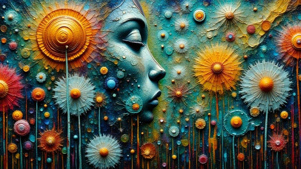 This image depicts a surreal mindscape with a central face surrounded by others showing various emotions, rendered as iridescent ceramic and glass mosaic with intricate, swirling patterns and luminous colors.