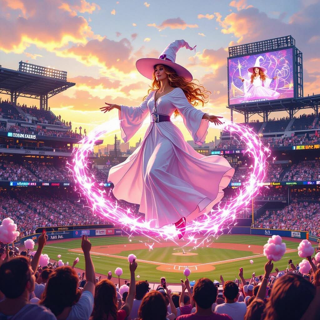 This image shows a pink witch casting a good luck spell over a baseball stadium. The vibrant and hyper-realistic digital painting captures a magical performance amidst cheering fans in a warm sunset glow.