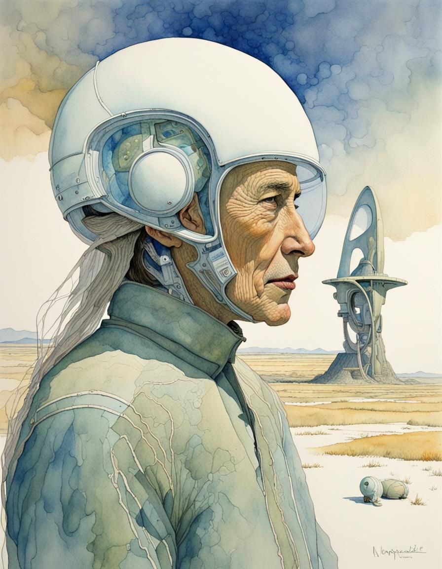 This image shows a biometric engineer design in watercolor art. The painting uses transparent washes and dry edges to create a striking visual effect in a moebius style.