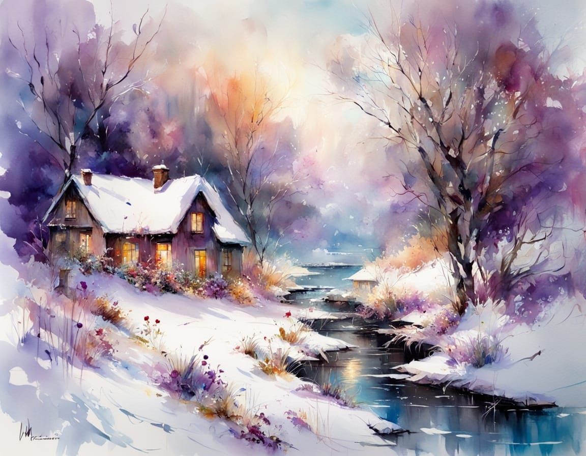This image depicts a serene winter scene with a sunny day, a river, and a house, rendered in a delicate watercolor style reminiscent of Willem Haenraets' ethereal and cinematic approach, with a focus on intricate details and a palette of purple, blue, pink, lilac, gold, and teal hues.