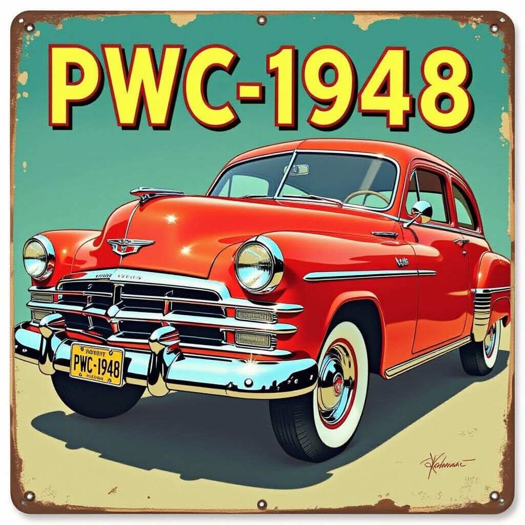 This image showcases an authentic vintage 50s enamel sign. It features a close-up of a number plate reading "PWC-1948" on a classic red Chrysler, rendered with bold colors and distressed detail.