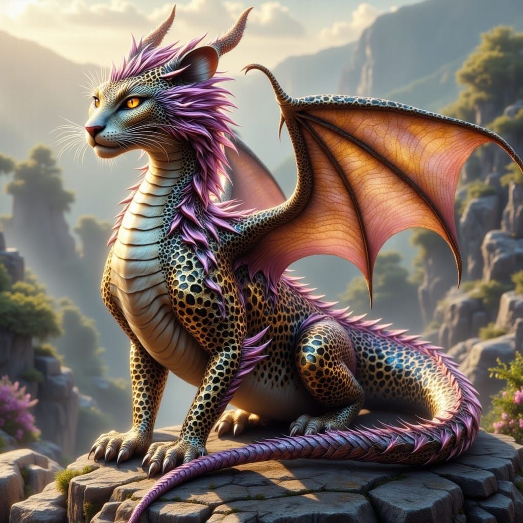 This image depicts a mythical leopard-dragon, a hybrid creature with feline grace and dragon power. Its body is adorned with shimmering prismatic scales in gold, violet, and pink, featuring black rosette spots.