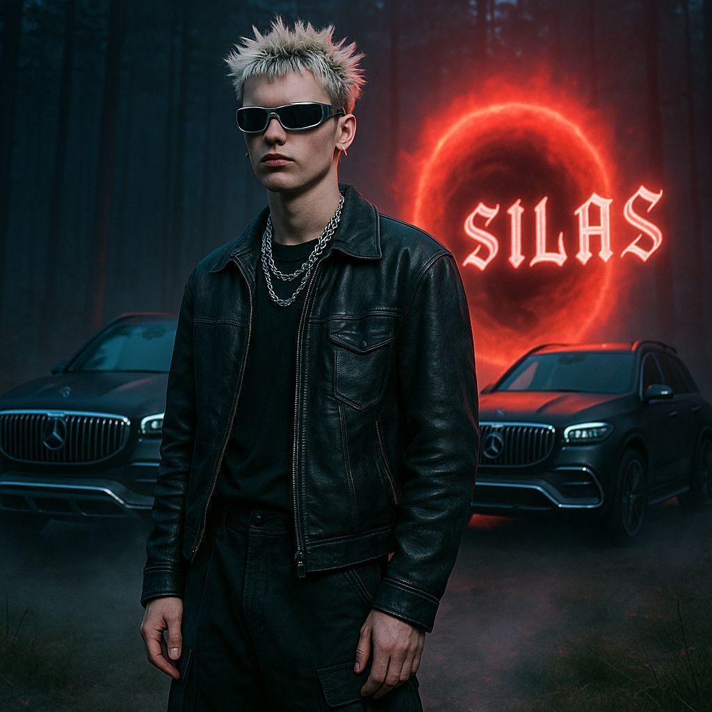 A hyperrealistic photo of a young male model in Y2K-inspired attire, confidently standing in a forest clearing. Two black SUVs are parked behind him, with a surreal red portal and neon letters in the background. The image has moody twilight lighting.