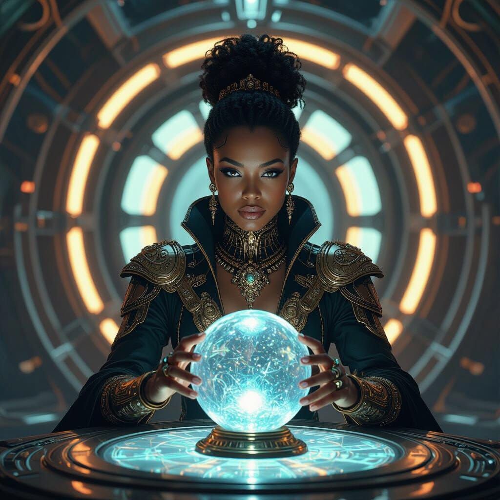 A striking picture of a cyborg fortune teller on a spaceship. She is surrounded by ornate, curved architecture, and the scene is lit with dynamic lighting in an art nouveau style.