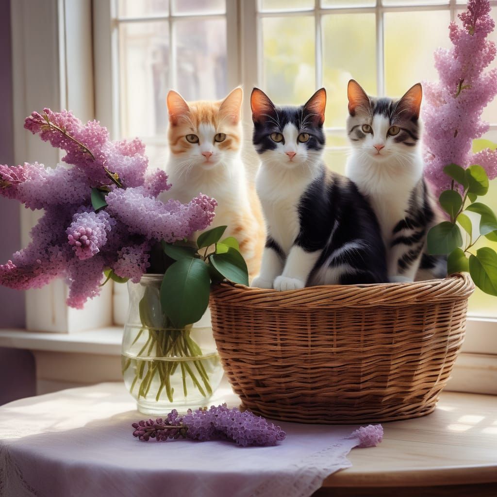 A dreamy, impressionist painting of two adorable kittens in a wicker basket next to a bouquet of lilacs, set against a warm, golden light and soft pastel colors.