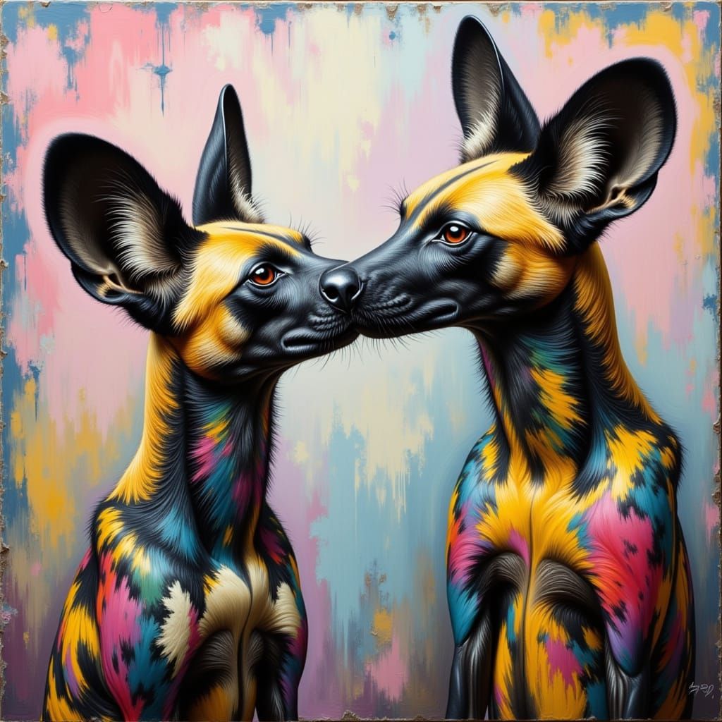 This image shows one African painted dog painting another. The artwork has a surreal and colorful abstract aesthetic with playful patterns.