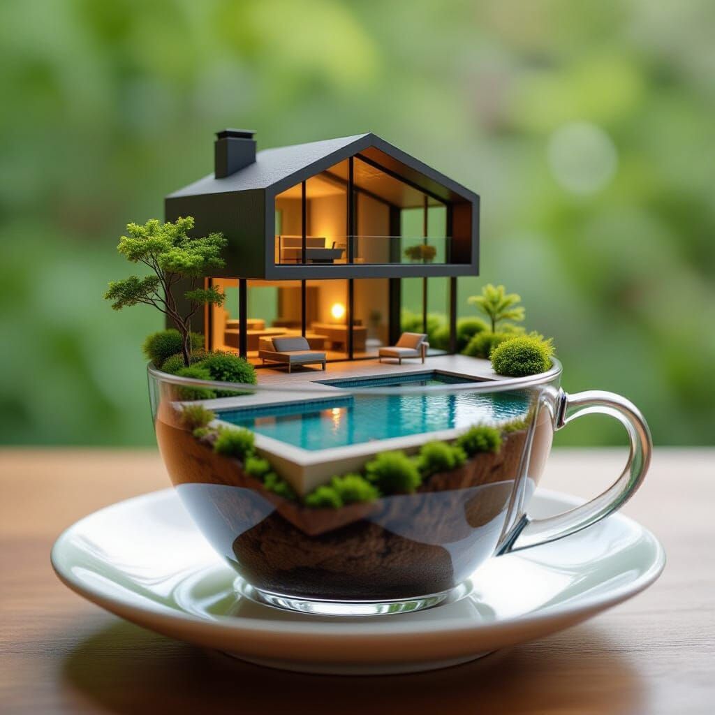 This image shows a miniature glass house with a garden and pool, all contained within a coffee cup. It's a surprising and delightful miniature scene.