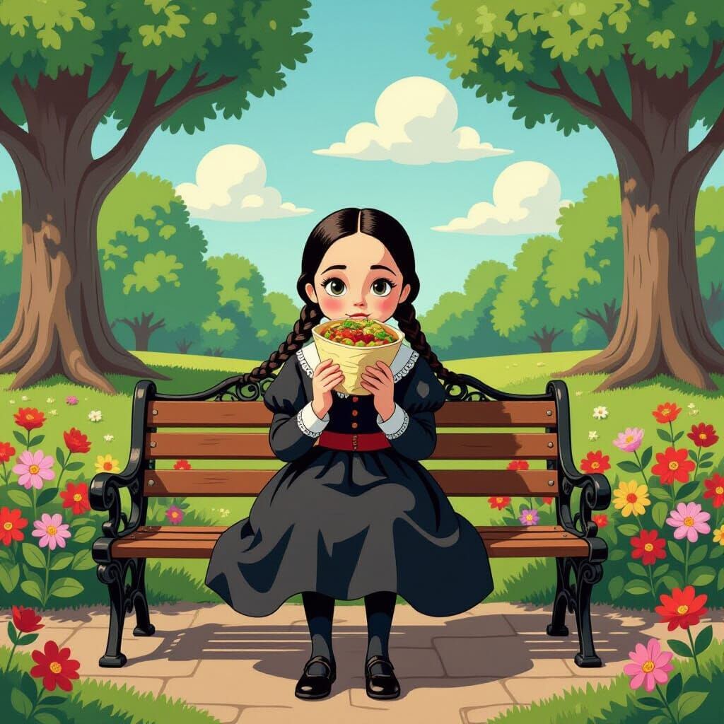 This image shows Wednesday Addams eating a burrito on a park bench. The scene features blooming flowers, trees, and a sunny sky, rendered with intricate detail and muted colors.