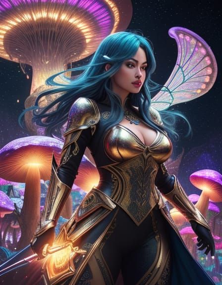 This image showcases a stunning, high-contrast digital artwork featuring a beautiful fairy surrounded by luminous mushrooms and flying dragons in a breathtaking galaxyscape, with vibrant colors and intricate details.