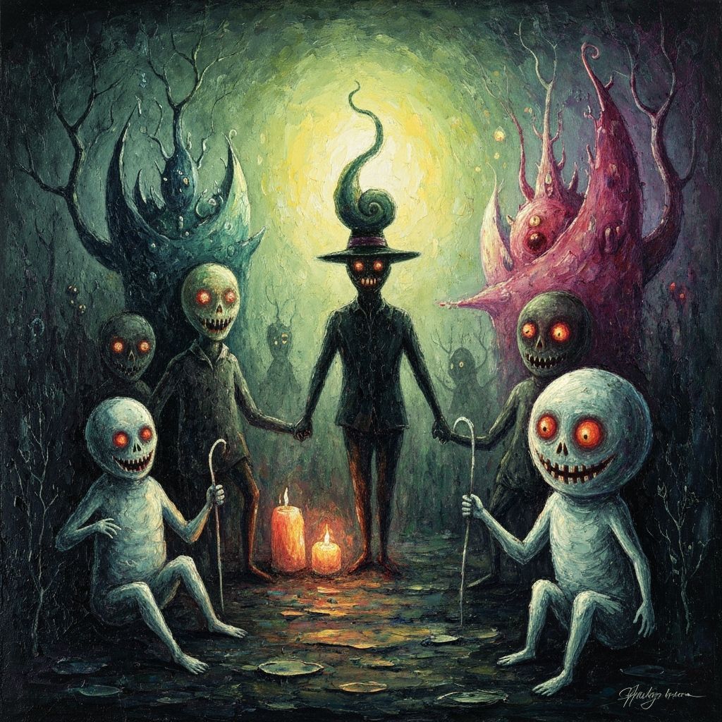 This image depicts a dark, moody Halloween scene with thick, textured layers of gouache and watercolor. It blends surrealism, whimsical horror, and dramatic lighting for a museum-quality, epic impressionist artwork.