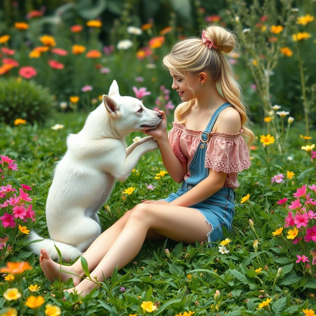 A digital painting shows a blonde girl in a ponytail, wearing a pink top and denim shorts, sitting barefoot in a flower garden. She lovingly pets a white puppy in this fantasy concept art.
